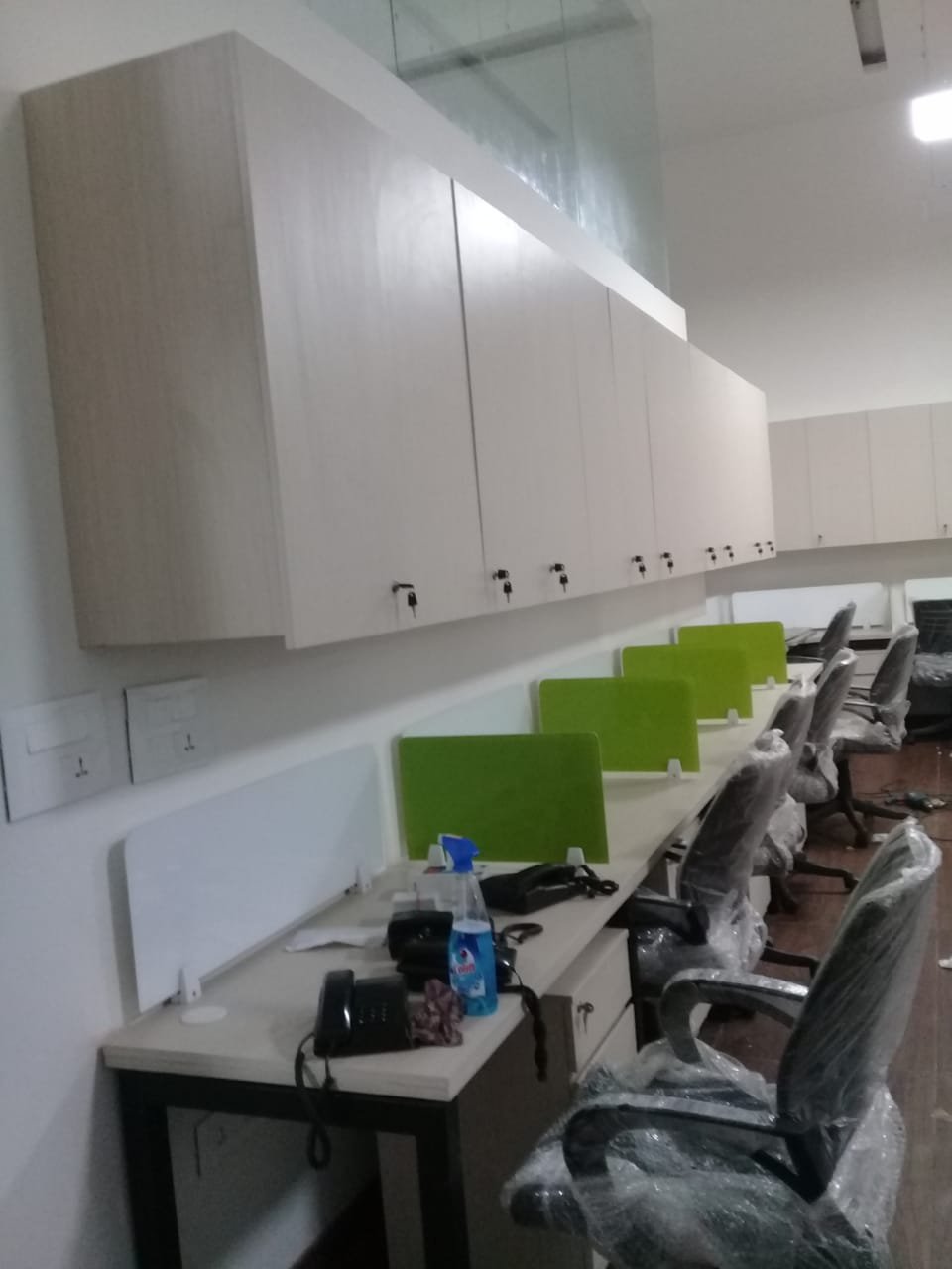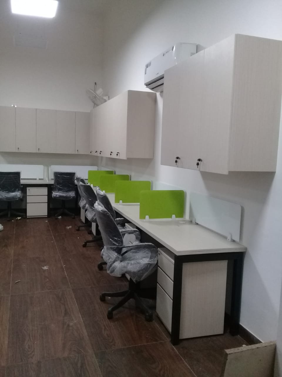 - Integrated storage solutions like filing cabinets, shelving units, and cubicle systems to keep the workspace clutter-free.